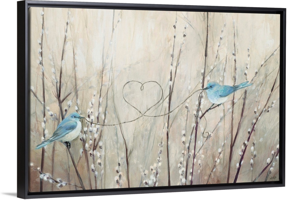 <p>Contemporary artwork featuring two blue birds tying a heart knot over a neutral background.</p>
