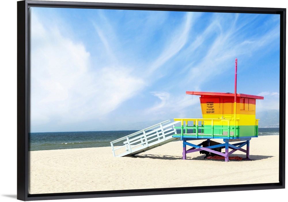 <p>A vibrant photo of a lifeguard tower in the colors of the pride flag, located at Venice Beach, Los Angeles</p>