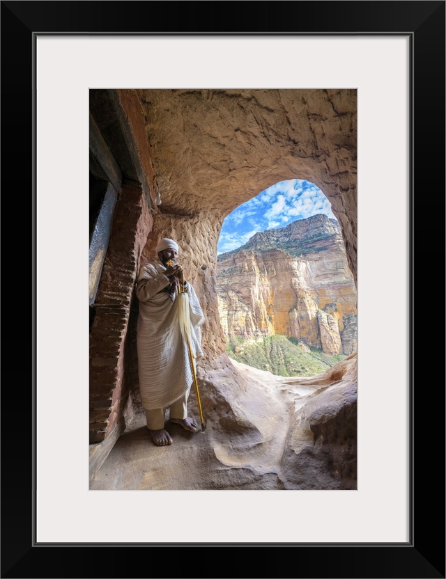 <p>Ethiopian Orthodox priest holding the hand cross at entrance of Abuna Yemata Guh church, Gheralta Mountains, Tigray, Ethiopia, Africa</p>
