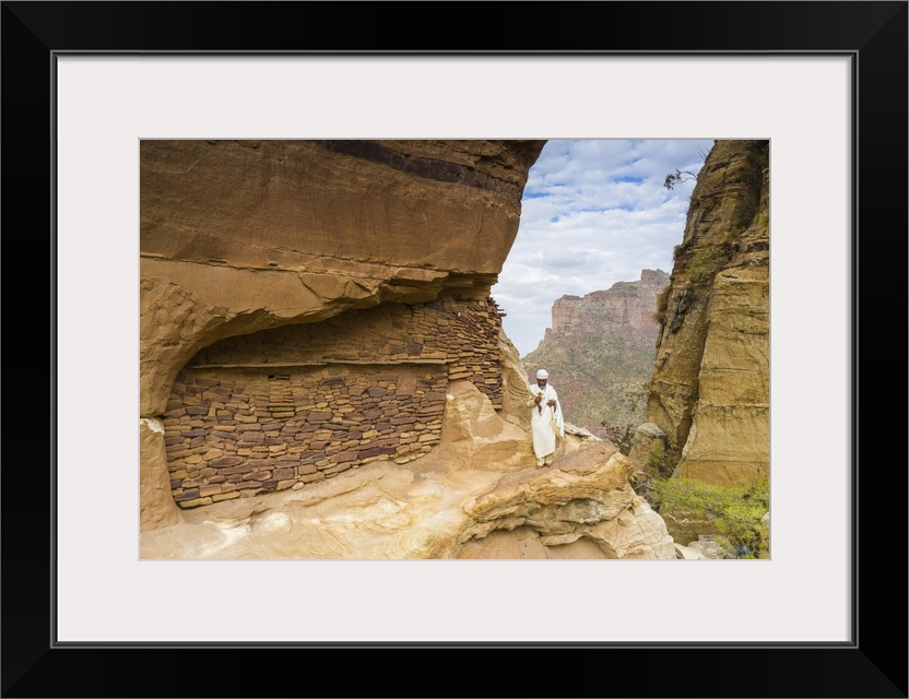 <p>Priest holding the hand cross on rocks outside Abuna Yemata Guh church, Gheralta Mountains, Tigray Region, Ethiopia, Africa</p>