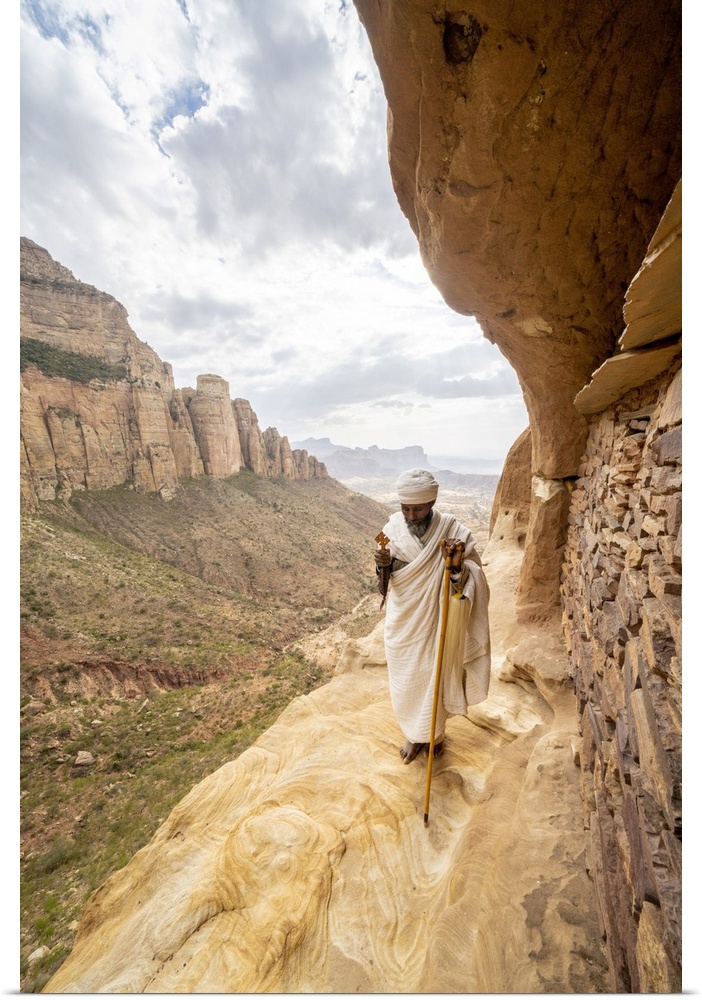 <p>Priest holding the hand cross on rocks outside Abuna Yemata Guh church, Gheralta Mountains, Tigray Region, Ethiopia, Africa</p>
