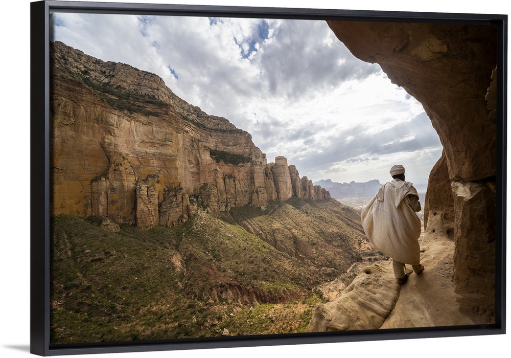 <p>Rear view of priest walking on access trail to the rock-hewn Abuna Yemata Guh church, Gheralta Mountains, Tigray region, Ethiopia, Africa</p>