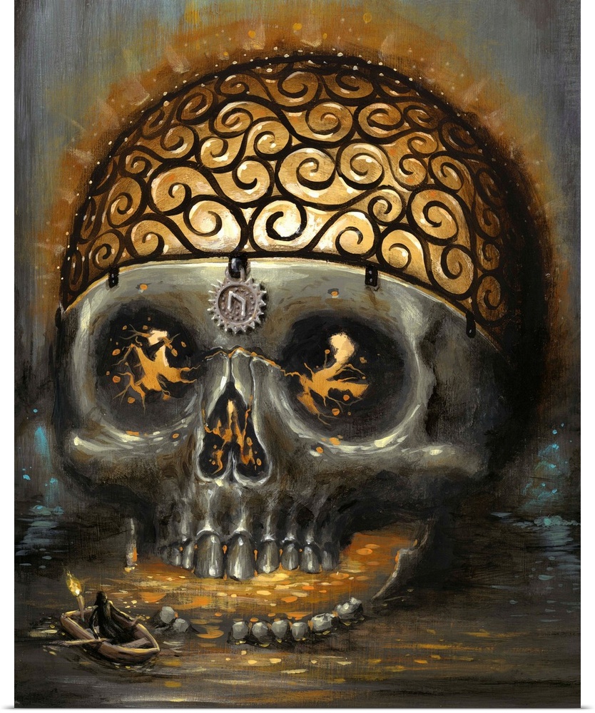 <p>Surrealist painting of a human skull with the top half of the skull a wire cage frame with light pouring from the openings.</p>