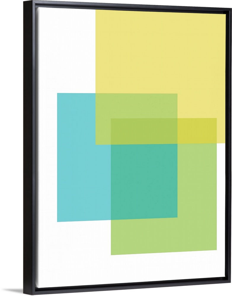 <p>Abstract geometric painting of rectangular overlapping shapes in blue, green, and yellow on white.</p>