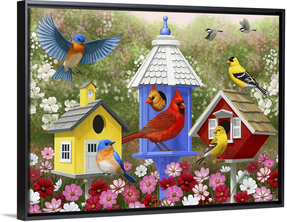 <p>Several songbirds including cardinals, bluebirds, and goldfinches visiting birdhouses.</p>