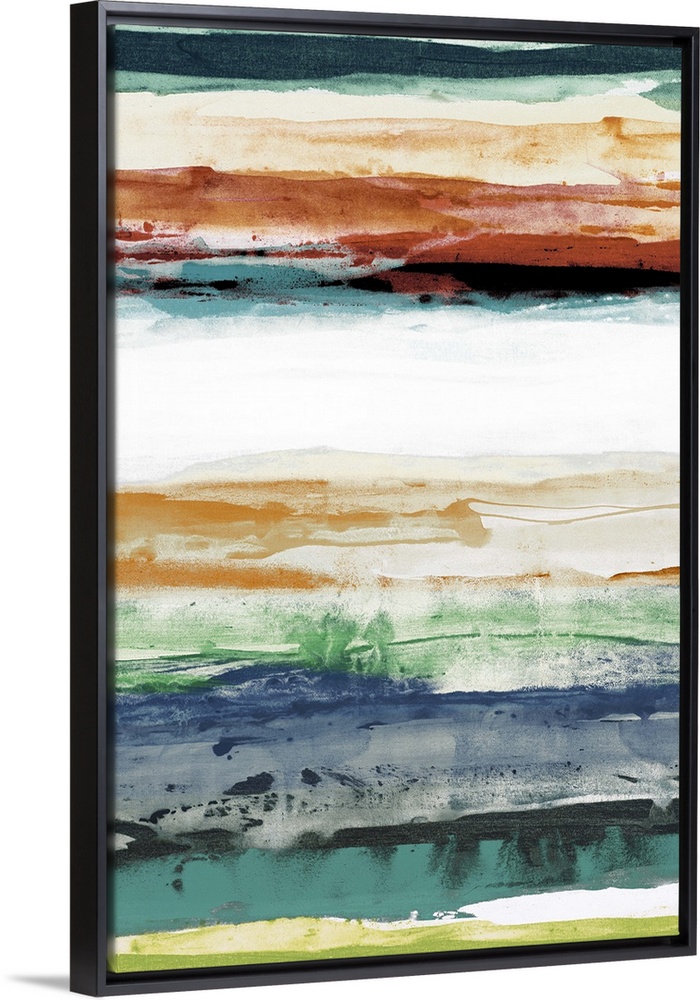 <p>Contemporary abstract painting using cool and warm tones to create horizontal lines.</p>