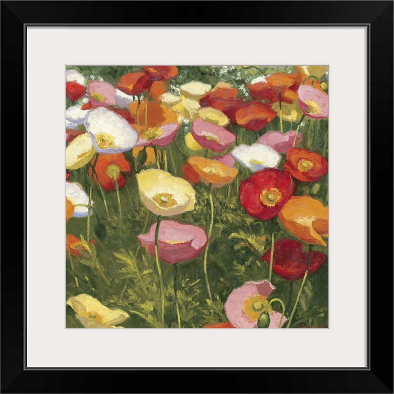 <p>This square shaped decorative accent is a contemporary impressionistic painting of poppies growing in a cluster together.</p>