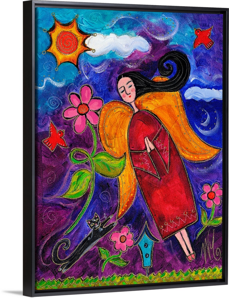 <p>An angel with large orange wings flying through the air.</p>