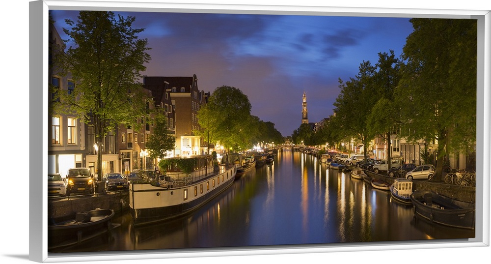 <p>Prinsengracht canal and Westerkerk at dusk, Amsterdam, Netherlands.</p>
