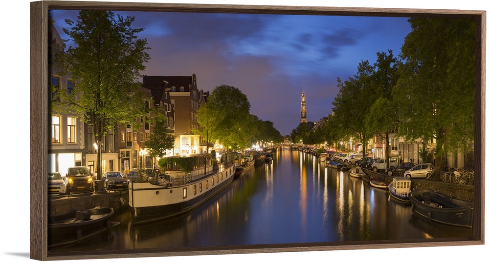 <p>Prinsengracht canal and Westerkerk at dusk, Amsterdam, Netherlands.</p>