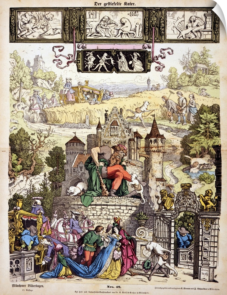 <p>Print. Illustration shows scenes from fairy tale Puss in Boots. Artist is Moritz von Schwind.</p>
