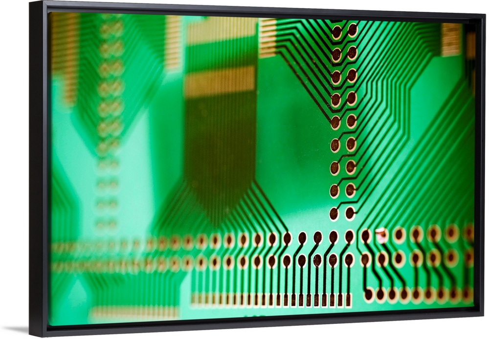 <p>Printed circuit board (PCB), showing the holes into which component connections are inserted and soldered. The metal etchings (thin lines) on the PCB provide the connections between the components.</p>