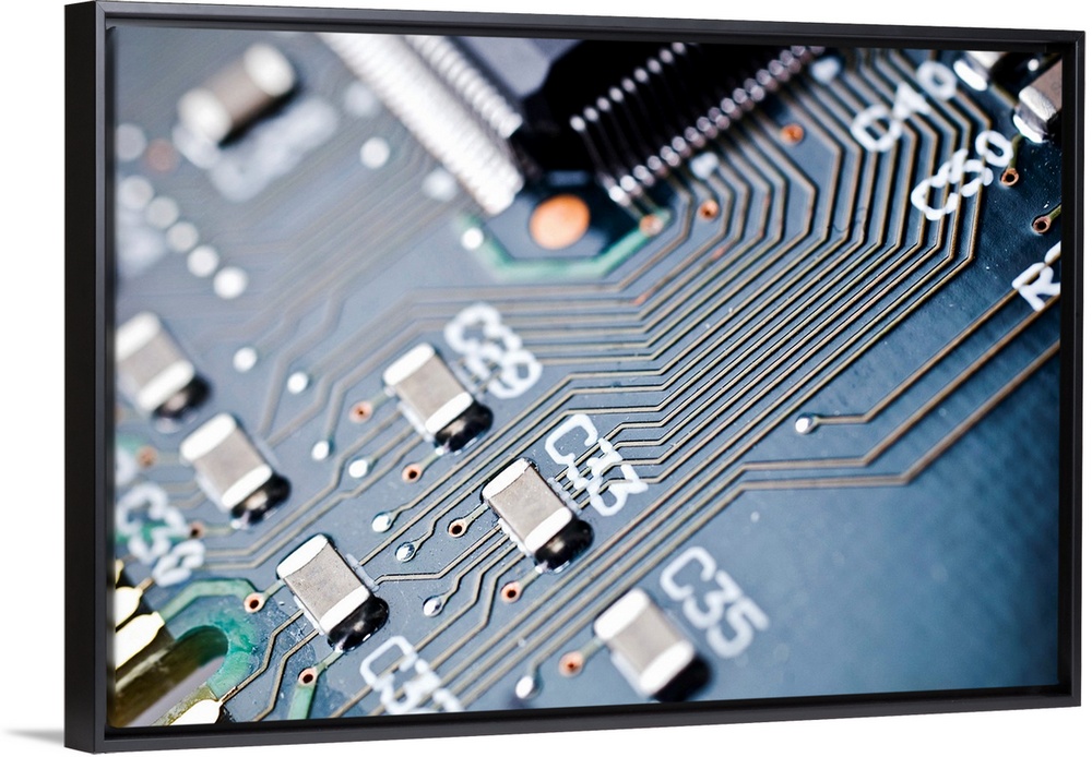 <p>Printed circuit board components. Electronic components soldered into a printed circuit board (PCB). The metal etchings (thin lines) on the PCB provide the connections between the components.</p>