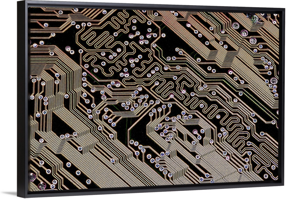 <p>Printed circuit board (PCB). Computer artwork of the PCB from a motherboard (main circuit board) of a personal computer (PC). PCBs are non-conductive sheets laminated with copper pathways, or traces, that are used to mechanically support and electrically connect electronic components. Motherboard components include transistors, diodes, resistors, capacitors and inductors. Motherboards contain the main processing parts of a computer system, including the microprocessor, memory and connecting wires to other parts of the computer.</p>