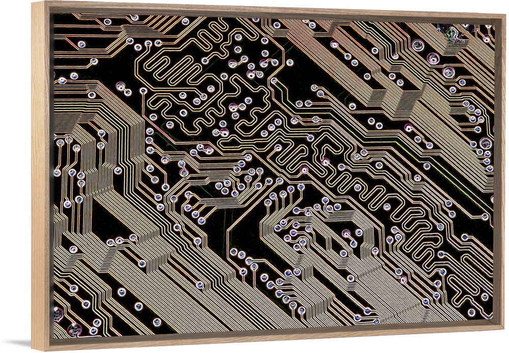 <p>Printed circuit board (PCB). Computer artwork of the PCB from a motherboard (main circuit board) of a personal computer (PC). PCBs are non-conductive sheets laminated with copper pathways, or traces, that are used to mechanically support and electrically connect electronic components. Motherboard components include transistors, diodes, resistors, capacitors and inductors. Motherboards contain the main processing parts of a computer system, including the microprocessor, memory and connecting wires to other parts of the computer.</p>