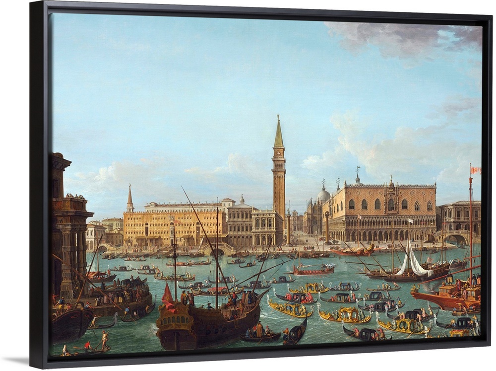 <p>Procession of Gondolas in the Bacino di San Marco, Venice, by Antonio Joli, 1742-60, Italian painting, oil on canvas. Gilded gondolas start up the Grand Canal with the heart of Venice as a backdrop</p>