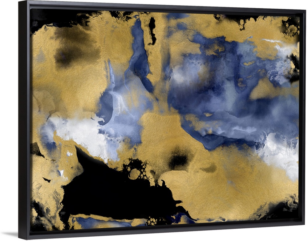 <p>Abstract painting with black and metallic gold on an indigo and white background.</p>
