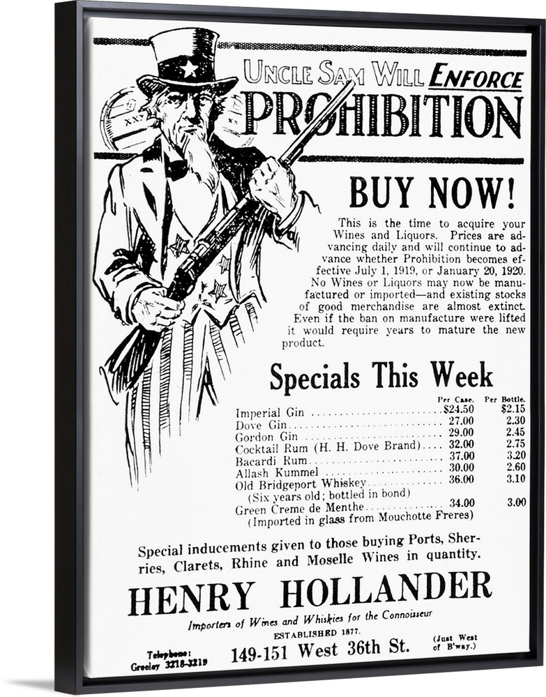 <p>'Uncle Sam Will Enforce Prohibition. Buy Now!' Advertisement for a wine and liquor importer in the 'New York Times,' 4 May 1919, urging consumers to take advantage of legal alcohol sales while they were permitted, following passage of the 18th Amendment to the U.S. Constitution.</p>