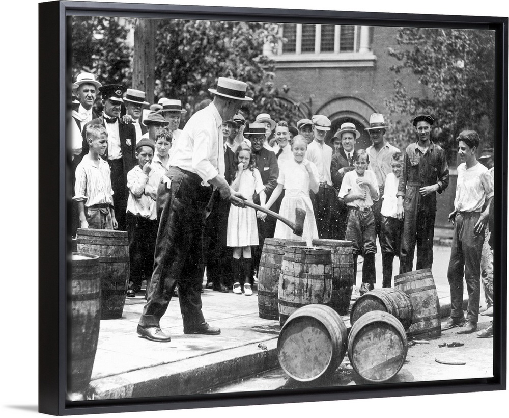 <p>Federal agent destroying contraband kegs of alcohol in Chicago during the 1920s.</p>