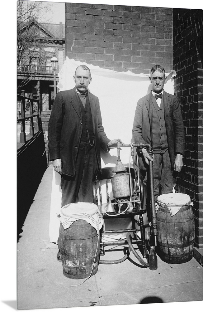 <p>Prohibition era photograph of two men posing with an illegal whiskey still.</p>
