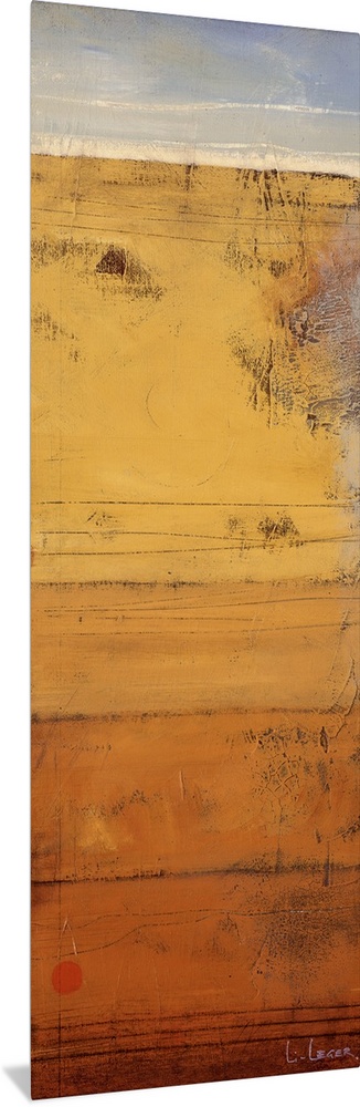 <p>A long vertical abstract is textured shades of orange, yellow and gray.</p>