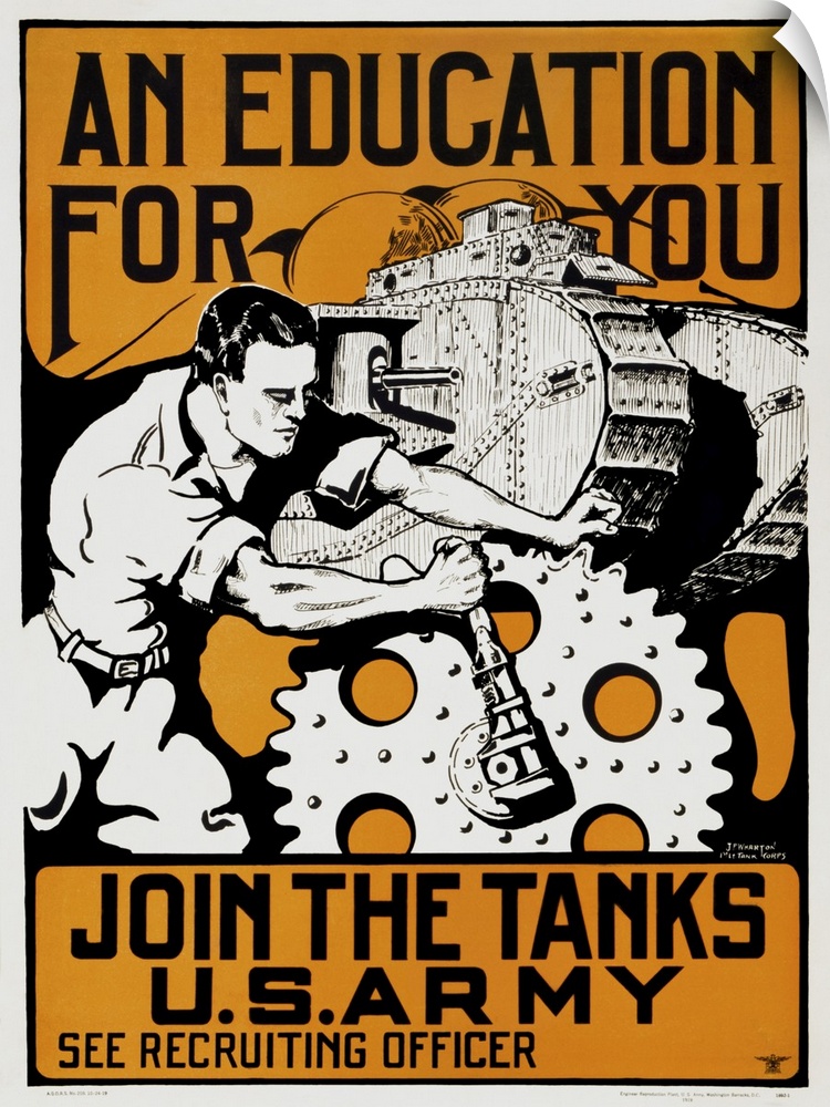 <p>Propaganda print of a man conducting mechanical repairs on a U.S. Army tank. Released during the decade spanning the First World War by the U.S. Army Tank Corps Recruiting Office, the print is indicative of employment opportunities in the U.S. Army and provision of military education.</p>