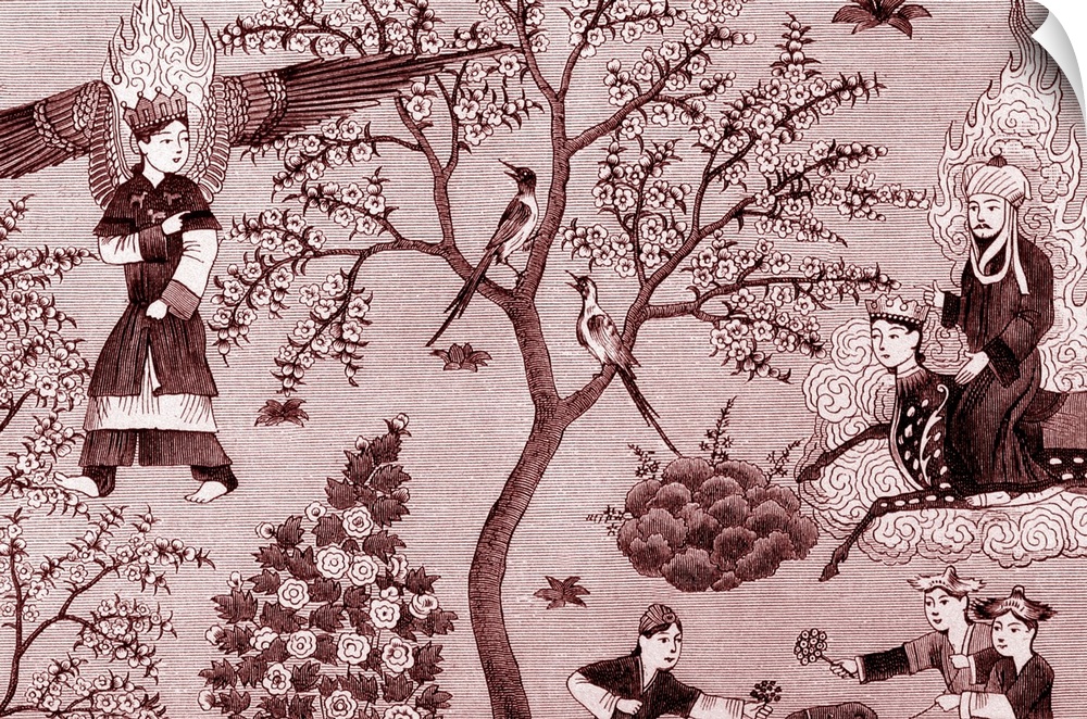 <p>Prophet Muhammed in Paradise Gardens. 1884 reproduction of an illustration from a Persian Miniature depicting the Prophet Muhammed in Paradise.</p>