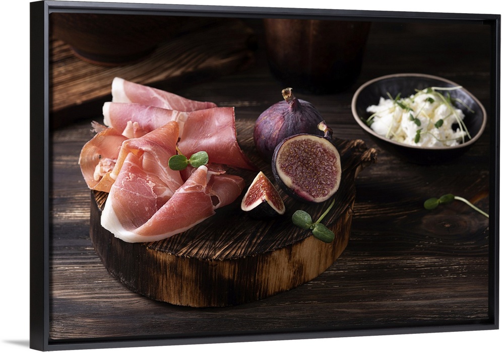 <p>Prosciutto slices with figs on a dark wooden background, appetizer from dry cured ham. Rustic style. Ukraine.</p>