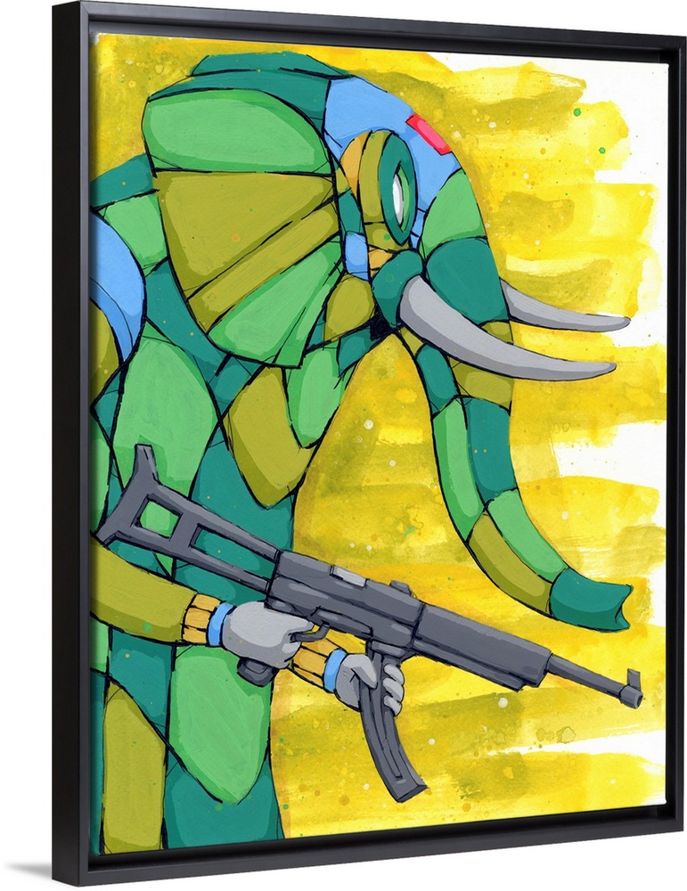 <p>Geometric painting of an elephant carrying a gun, using camouflage colors and a bright yellow background.</p>