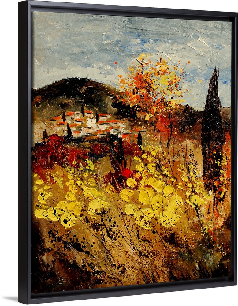 <p>A field of colorful flowers with to village of Provence, France in the background.</p>