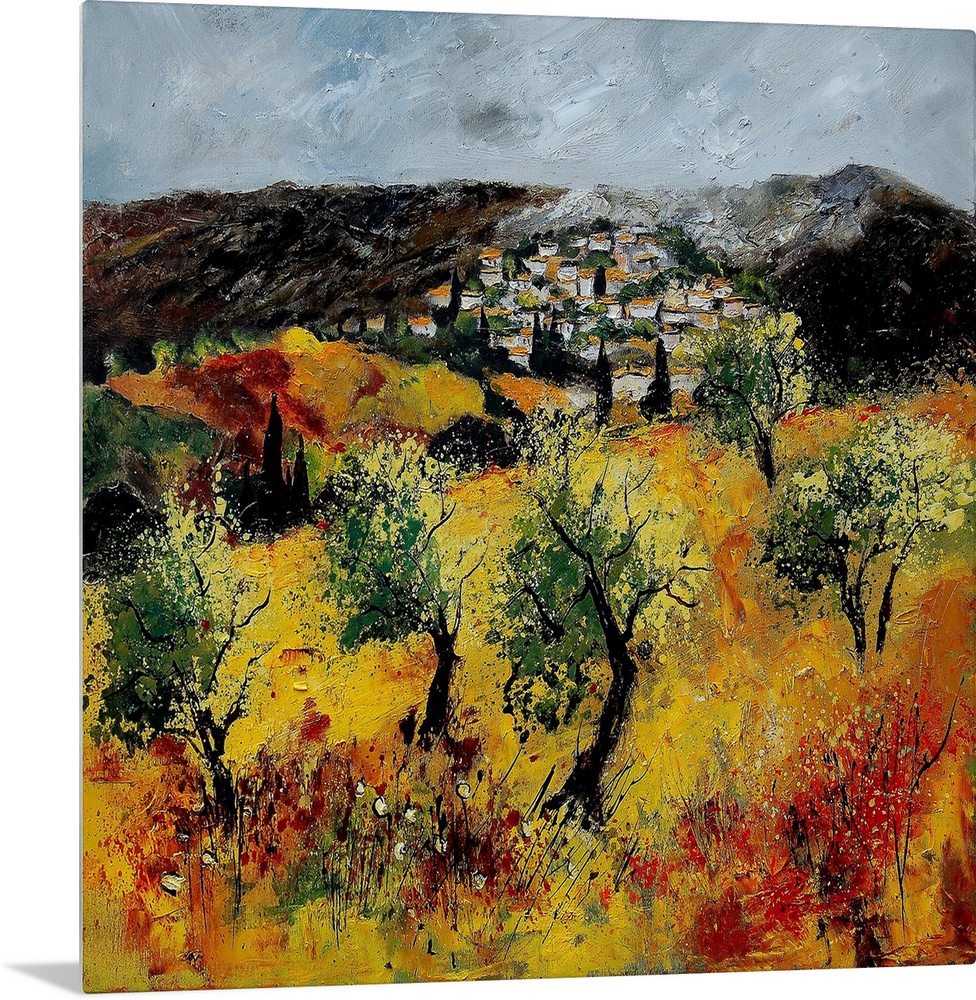 <p>A horizontal abstract landscape of a village with muted textured colors of green, orange and yellow.</p>