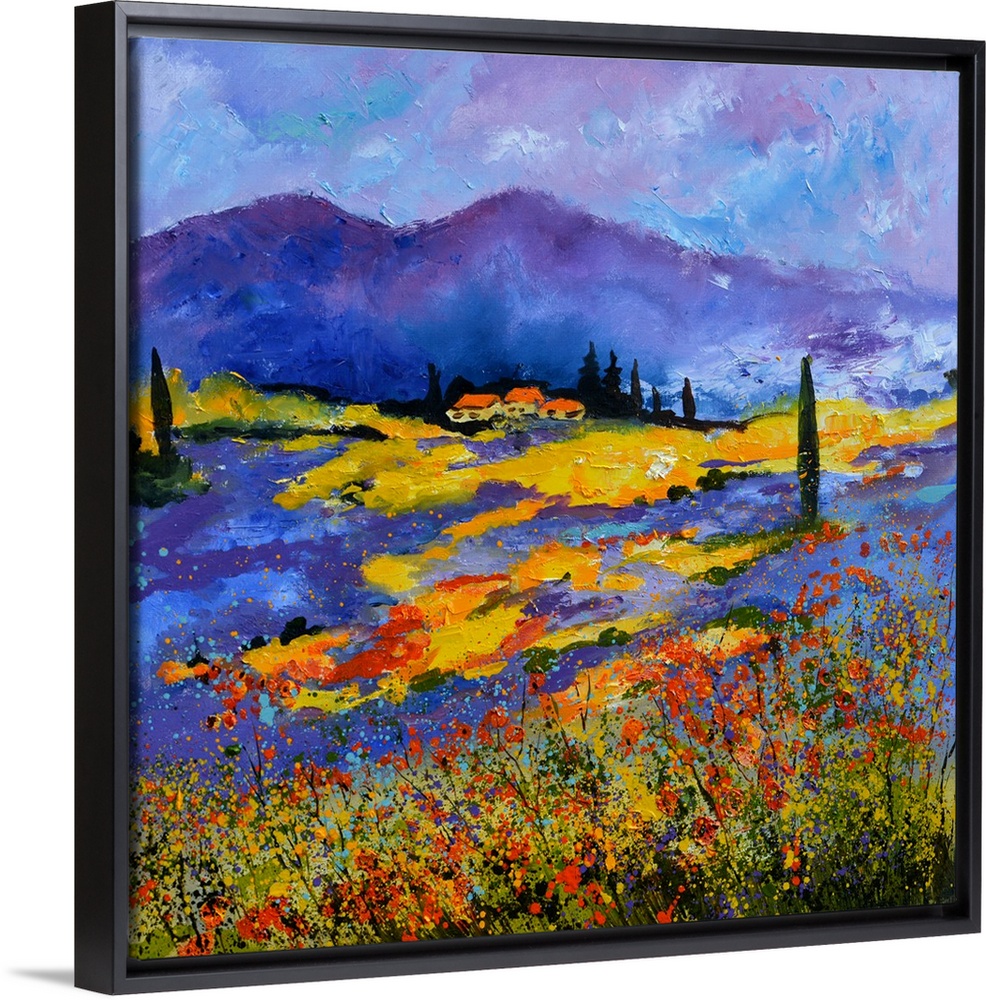 <p>Vibrant painting of a bright Summer day with blooming flowers in a field, a colorful sky, and village of Provence in the distance.</p>