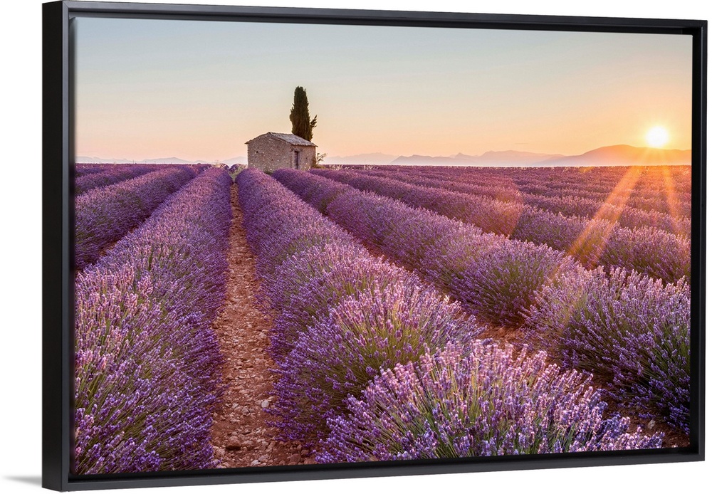 <p>Provence, Valensole Plateau, France, Europe. Lonely farmhouse and cypress tree in a Lavender field in bloom, sunrise with sunburst.</p>