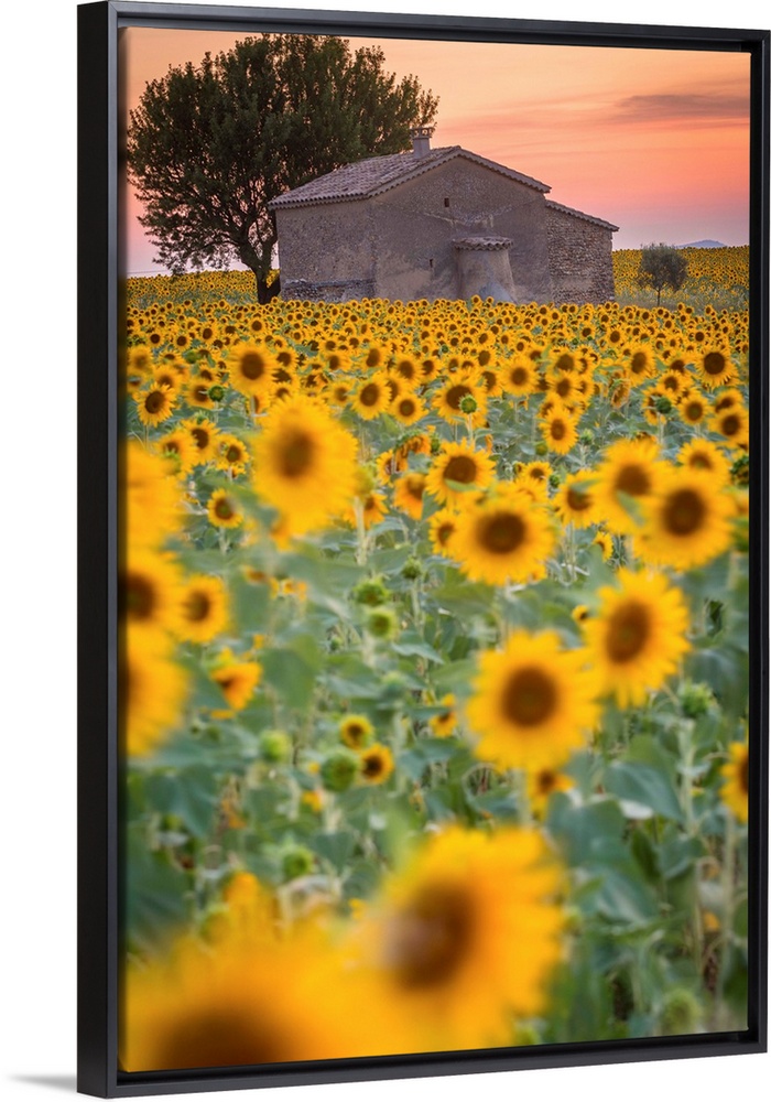 <p>Provence, Valensole Plateau, France, Europe. Lonely farmhouse in a field full of sunflowers, lonely tree, sunset.</p>