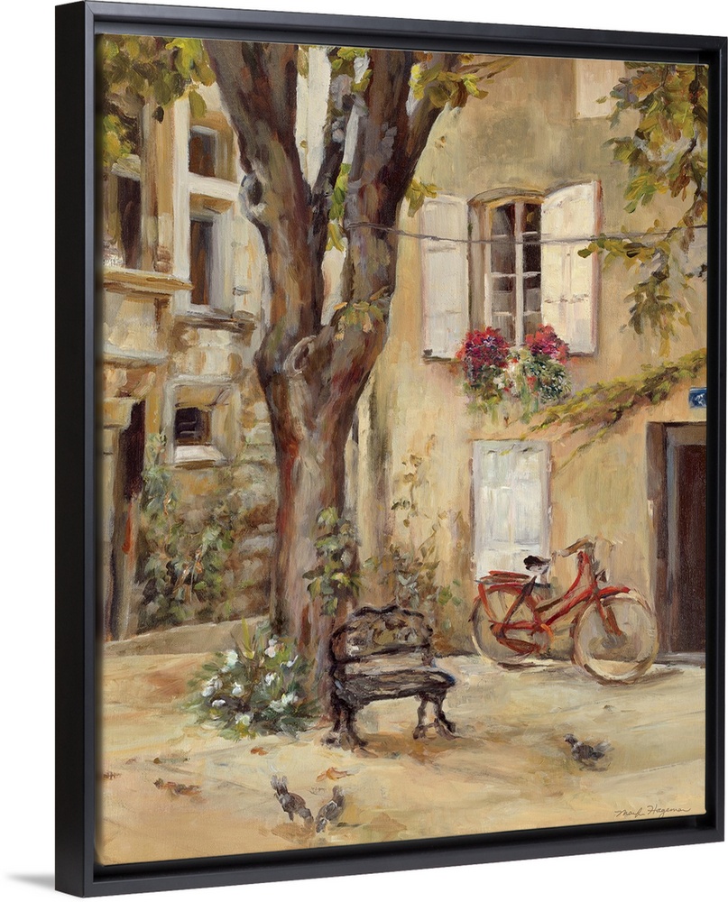 <p>Painting of building courtyard with huge tree growing in center. The building is covered with window with shutters and flower boxes. There is a bench and bicycle at the base of the tree.</p>