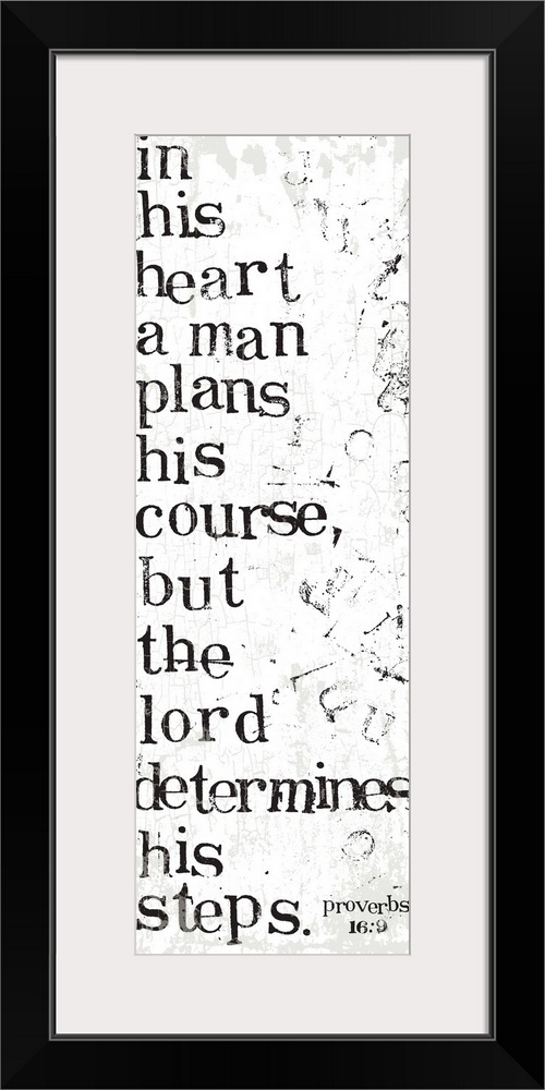 <p>Distressed black and white letter-stamped Bible verse scripture of Proverbs 16:9 In his heart a man plans his course, but the Lord determines his steps.</p>