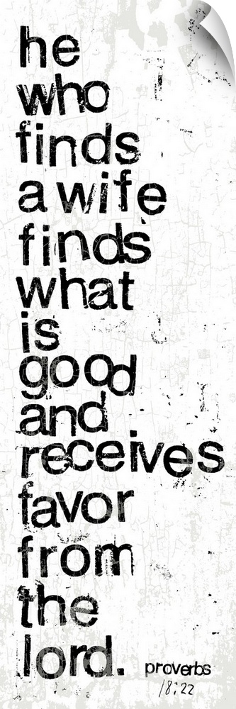 <p>Distressed black and white letter-stamped Bible verse scripture of Proverbs 18:22 He who finds a wife finds what is good and receives favor from the Lord.</p>