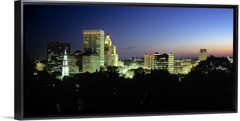 <p>Large landscape photograph of silhouetted tree tops in the foreground, overlooking the brightly lit skyline of Providence, Rhode Island, at dusk.</p>