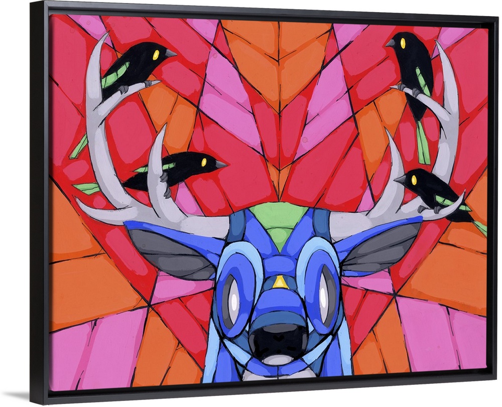<p>Pop art painting of a deer with four little birds resting on its antlers.</p>