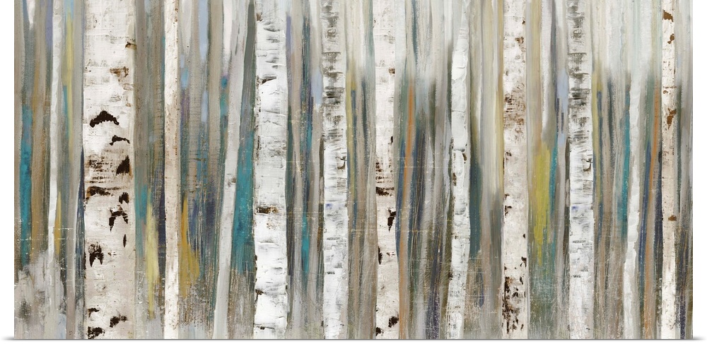 <p>Horizontal painting of tree trunks in shades of brown and gray.</p>