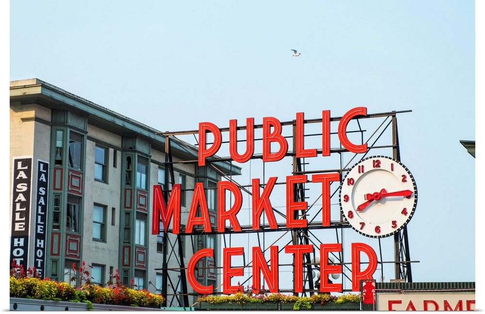 <p>Photograph of the red Public Market Center sign at the farmers market in downtown Seattle.</p>