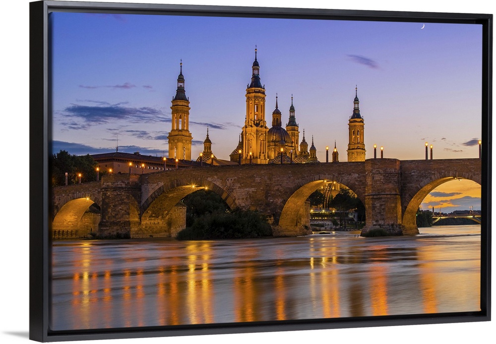 <p>Sunset view of Puente de Piedra bridge with Basilica de Nuestra Senora del Pilar church, Zaragoza, Aragon, Spain</p>