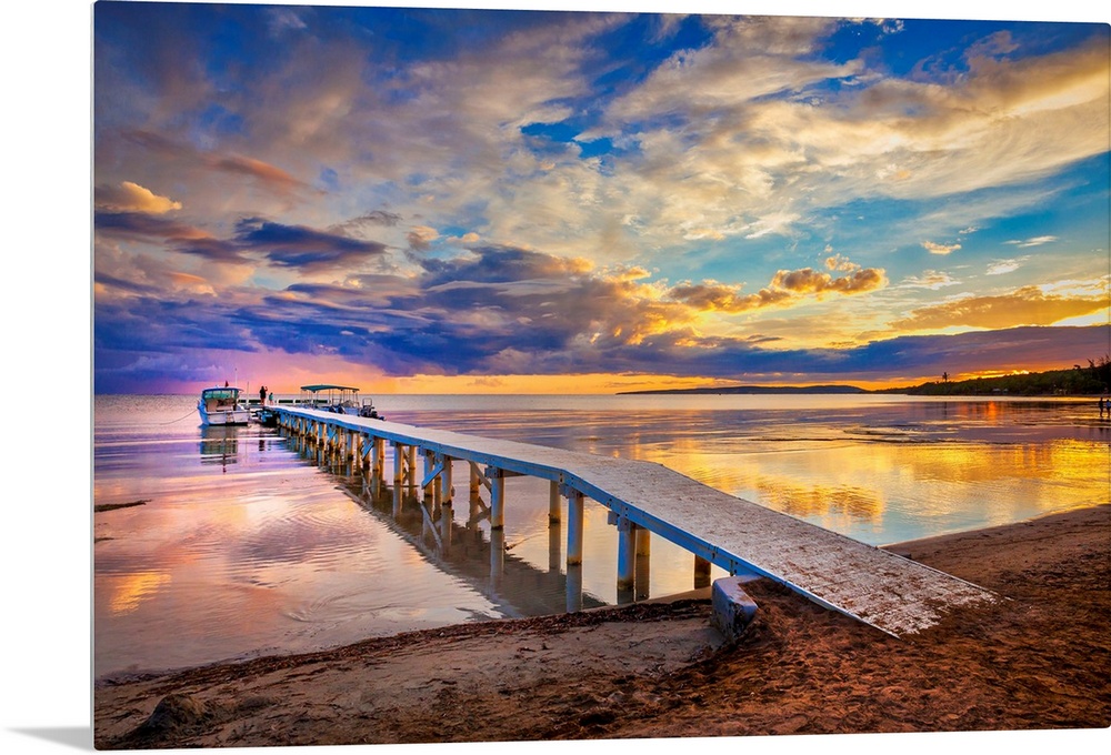 <p>Puerto Rico, Guanica, Copamarina Beach Resort and Spa, pier leading into water, boats.</p>