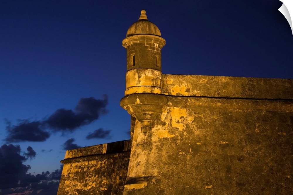 <p>Puerto Rico, San Juan, Old San Juan, San Felipe del Morro Fort, El Morro, fortress walls and watchtower, dusk</p>