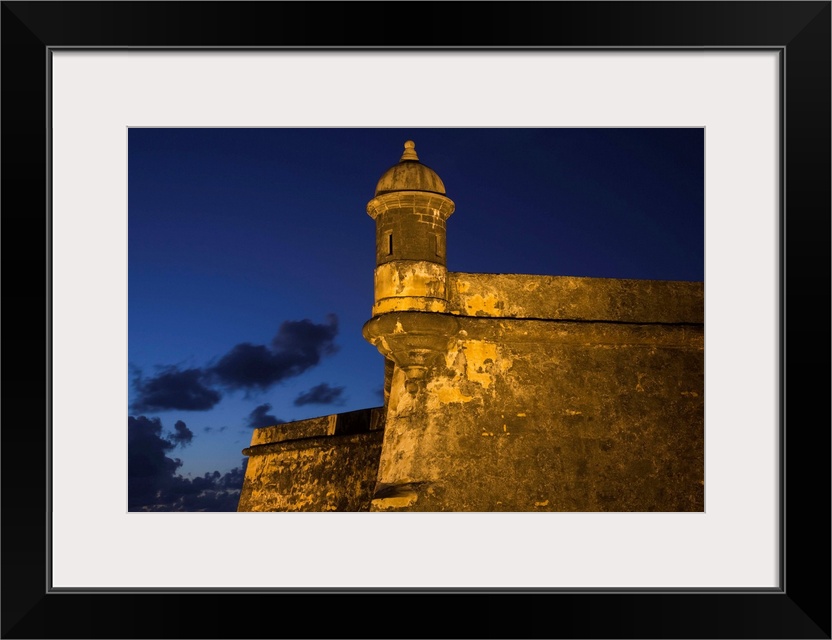 <p>Puerto Rico, San Juan, Old San Juan, San Felipe del Morro Fort, El Morro, fortress walls and watchtower, dusk</p>