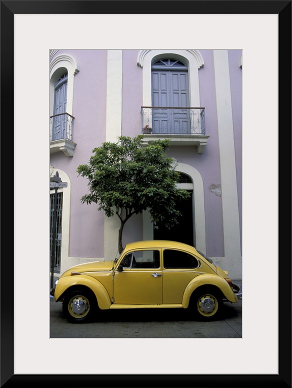 <p>Puerto Rico, Ponce, Historic District. 19th century pink and white house with yellow VW Beetle parked in front.</p>