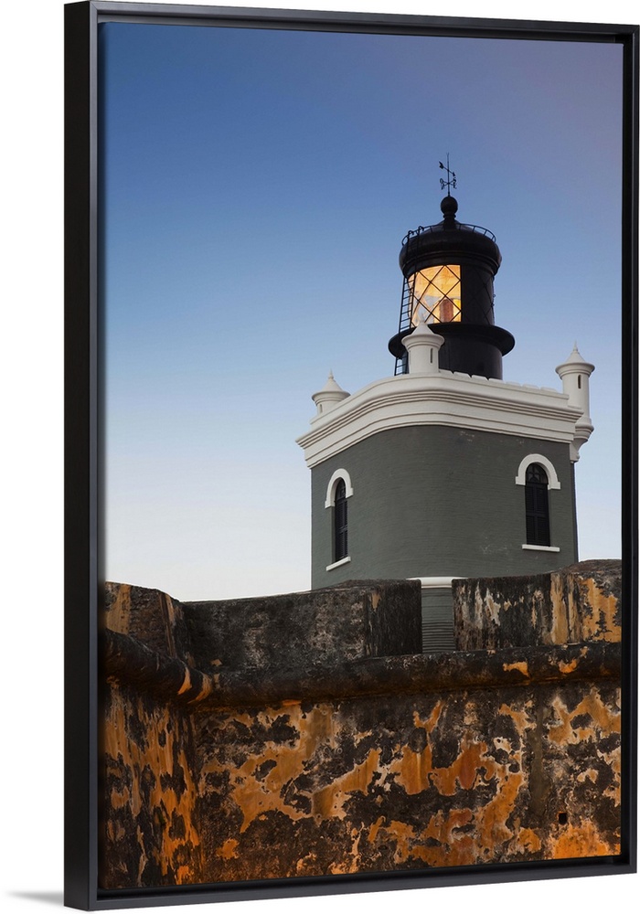 <p>Puerto Rico, San Juan, Old San Juan, San Felipe del Morro Fort, El Morro, fortress walls and lighthouse, dusk</p>