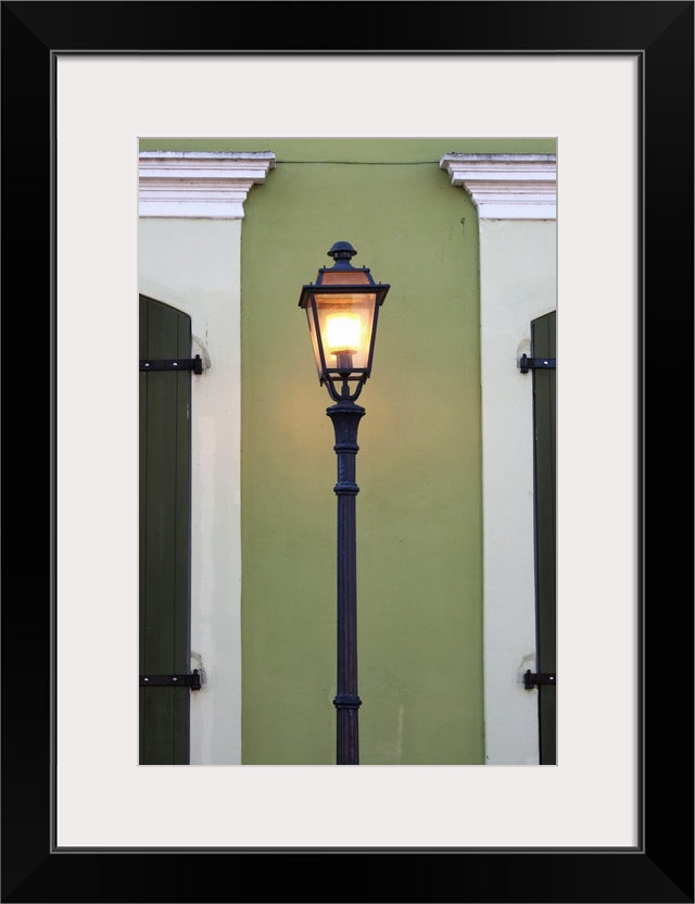<p>Puerto Rico, West Coast, San German, Plaza Francisco Mariano Quinones, streetlight and colonial building</p>
