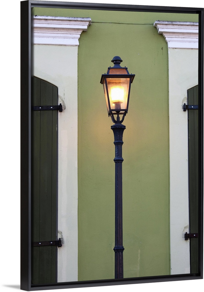 <p>Puerto Rico, West Coast, San German, Plaza Francisco Mariano Quinones, streetlight and colonial building</p>
