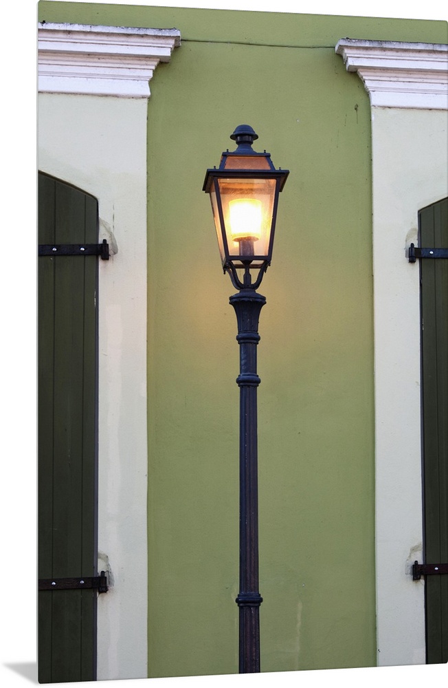 <p>Puerto Rico, West Coast, San German, Plaza Francisco Mariano Quinones, streetlight and colonial building</p>